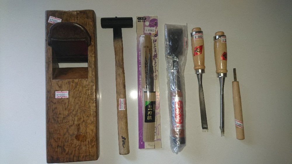 Chose promise...: en voilà pour environ 70 euros, les plus chers étant le rabot et le ciseau (16 euros chacun), le kiridachi (tranchet en langue de Moliere, pour 15 euros). Le reste est à moins de 8 euros pièce.