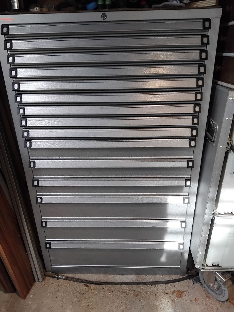 Et rangée. Rien pour travailler le bois là dedans. Plutôt ferraille, outils mécaniques, meuleuse, fer à souder, pièces qui pourraient servir, projets démontés en morceaux à remonter un jour, etc, etc. Quel plaisir d'avoir dans le même tiroir toutes les vis qui étaient dans de multiples boites jusque ...
