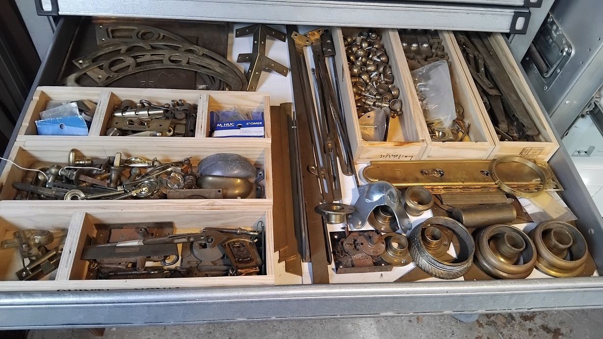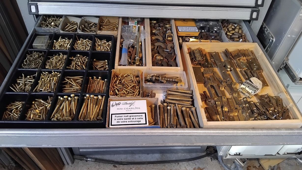 Bon, pour tout vous dire, jamais je n'utiliserais tout ça. Je vous fais des vues de détail. Si jamais vous recherchez quelque chose: charnières spécifiques, glissières d'abattant, serrures (en laiton, avec sa clé), etc, etc. Ou tout autre chose, il se peut que j'ai! Faites-moi un signe. Selon, je vou ...