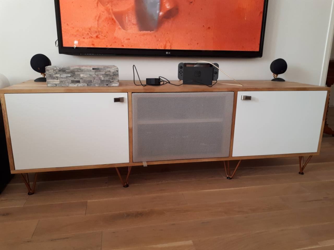 bonjour, pour les portes pourquoi pas en tole perforée comme sur les baies informatique....? ainsi que des petites fenêtres sur les cotés afin de ventiler au mieux...? et comme dit précedemment il faut que les portes s'ouvrent au moins à 110° minimum avez-vous pensé à faire le meuble entièrement en ...