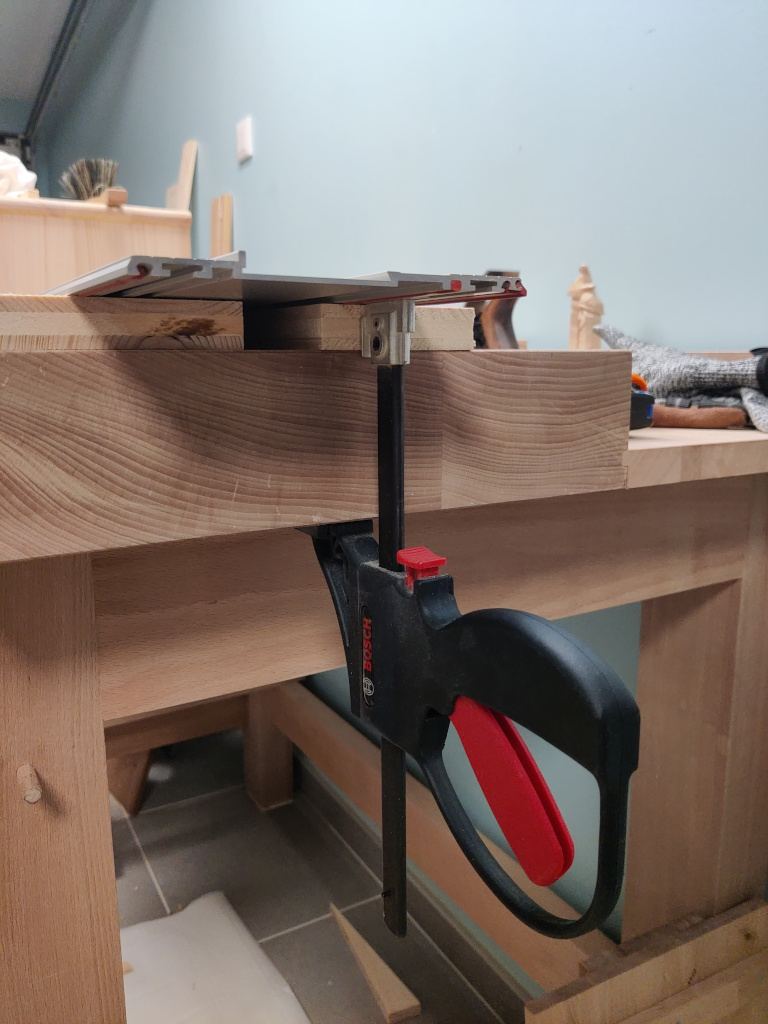 Personnellement je mets un serre-joint à chaque bout pour chaque coupe, j’ai deux serre-joints adaptés à mes rails.