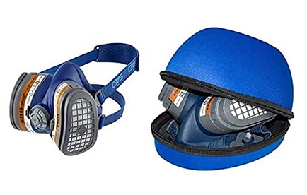 Demi masque GVS avec filtre P3 : c'est léger, on peut l'utiliser avec des lunettes et un casque anti bruit.