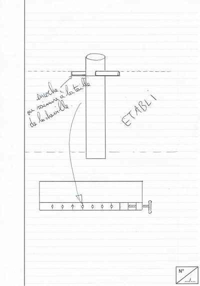 Une idée comme ça... Plutôt que de t'em....bêter à chaque fois que tu changes ta butée de place; à retirer ta cheville en dessous (faut se baisser, ça prend du temps, pis on sera vieux un jour), pourquoi ne pas mettre ta cheville en haut de la butée, au niveau du plan de travail. Il faut bien sûr faire des encoches dans le plateau de l'établi, mais je suis sût qu'avec une défonceuse, ça doit être possible (perso je n'en ai pas alors je ne suis pas formel). Du coup, la cheville s'enfonce de son épaisseur dans le plateau, bouchant ainsi la rainure, et ne peut donc plus ni tourner ni riper. Qu'en penses-tu? cf dessin si je ne suis pas clair