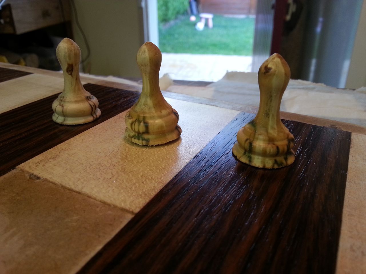 Quelques photos de l'avancement.Le plateau est maintenant poncé, et en attente de finition, je finis mes essais sur des échantillons, et en attendant je tourne quelques pions.On voit bien les pores du palissandre, c'est pas moche, mais je préfèrerais les boucher. Je vais essayer avec de la poudre de ponce dont j'ai lu beaucoup de bien. Pour l'instant le rendu de la gomme laque est vraiment magnifique.