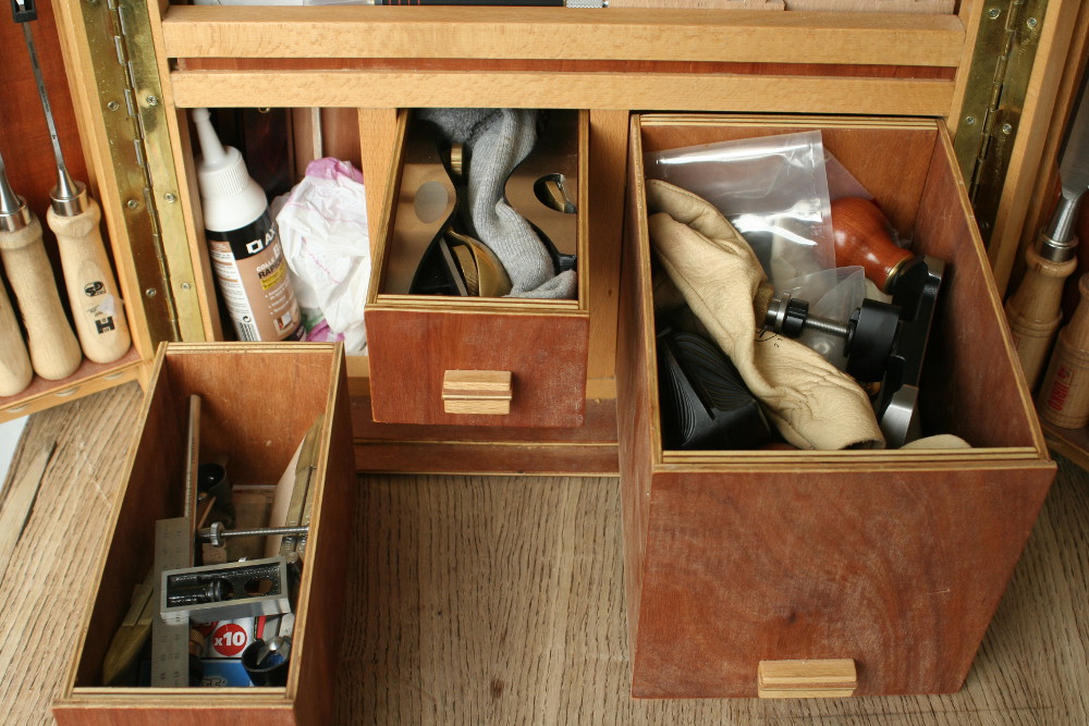 - Pour les tirroirs, il me reste de la place. Le tirroir du milieu avec les deux rabots c'est bien une chaussette qui les separe ! C'est principalement pour eviter qu'avec les vibrations de la voiture les rabots ce cognent et se rayent. Pareil pour le grand tirroir a droite mais cette fois ci j'ai utilise une paire de gants.