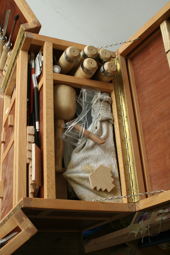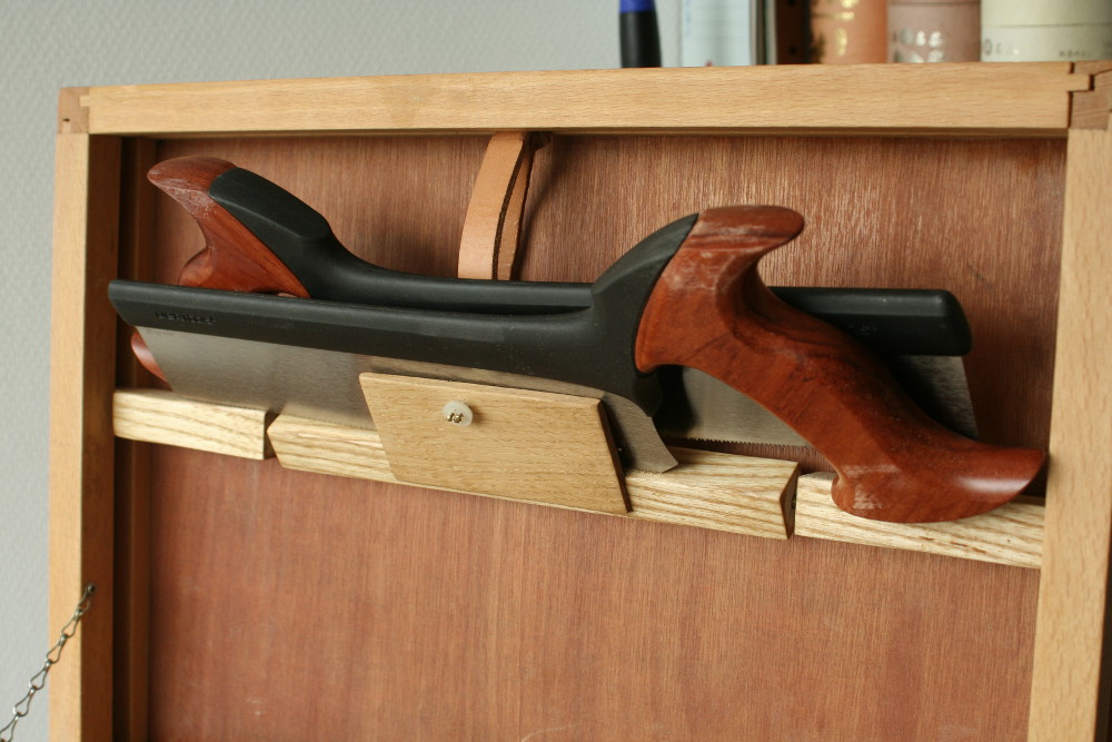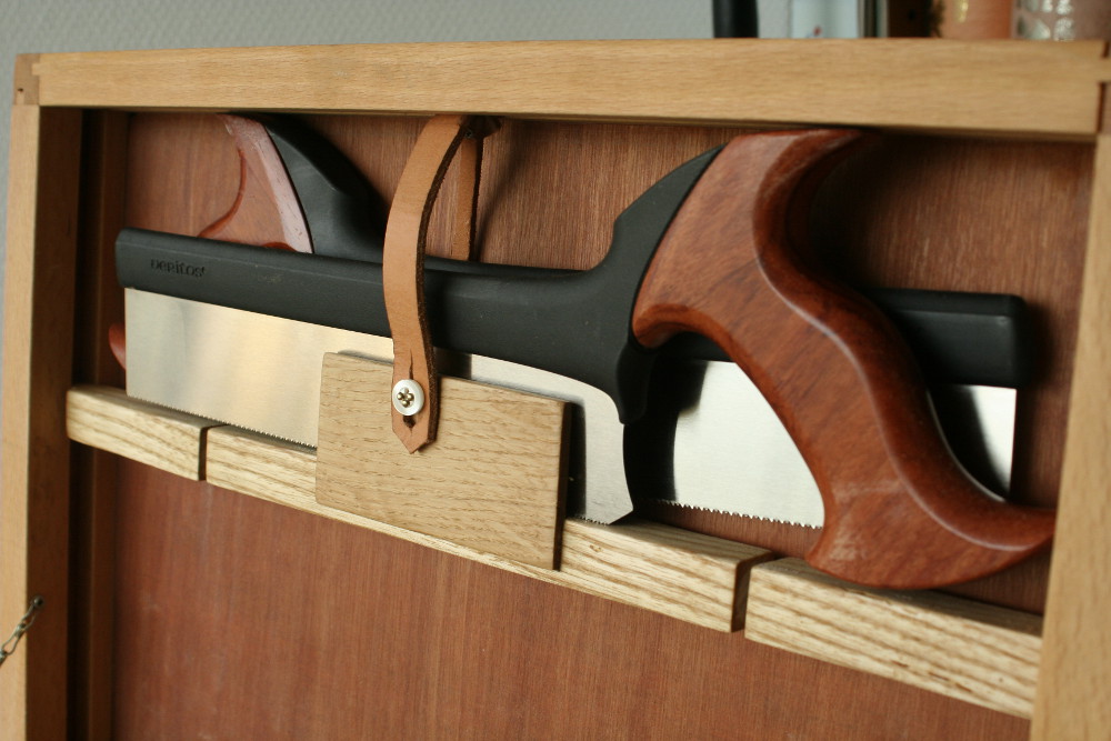 - Le porte scie a ete une addition tardive. Il est en frene et en chene (ils viennent du bac a chutes). Le tasseau du milieu pivote grace a deux vis dont j'ai coupe la tete et qui servent d'axe. Ainsi ferme les scies ne bougent pas et ouvert les scies sont accessibles. Pour tenir la laniere de cuir j'ai recupere un bouton sur une vieille chemise :)