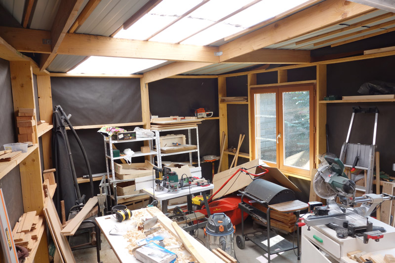 Il n'a pas isolé la dalle de la structure en bois avec une bande d'arase, ce qui fait que quand il pleut, j'ai de l'eau qui rentre par le bas. Surtout d'un coté ou l'atelier est adossé à un mur. L'eau ruisselle le long du mur et glisse donc ensuite dans l'atelier... Donc ma structure est régulièrement en contact avec l'eau, et je ne sais pas combien le temps elle va durer. Du coup, je ne me sers pas de la structure pour y mettre des choses.