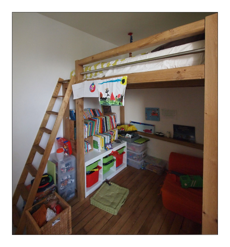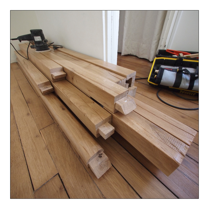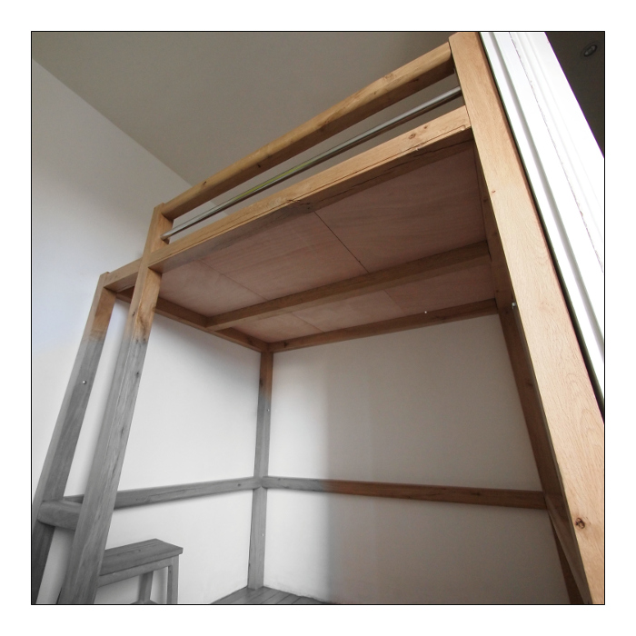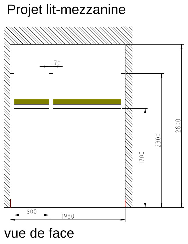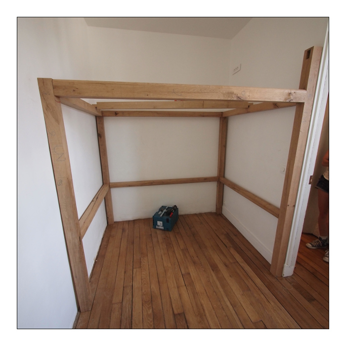 Je suis aussi preneur des critiques concernant la structure: je suis aidé en cela que le lit-mezzanine s’insérerait dans le renfoncement d'une chambre, donc les 4 montants en chêne seraient vissés (tire-fond à priori). Je comptais faire l'ensemble: montant, traverse, haut de rambarde en carrelet de 700x700 mm chêne.