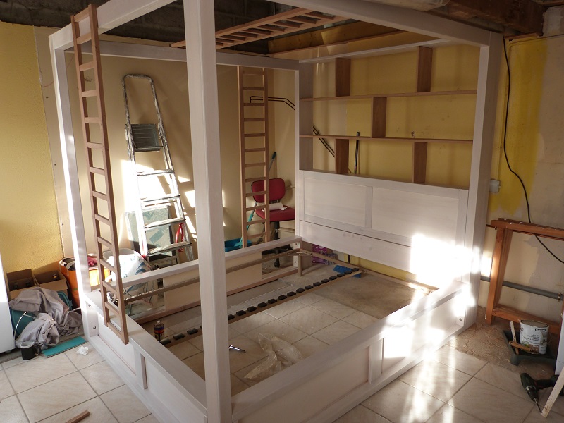 Comme je le disais, je viens de terminer un lit à baldaquin, inspiré d'un modèle du commerce (en mélaminé).