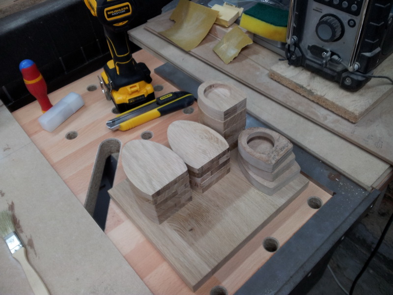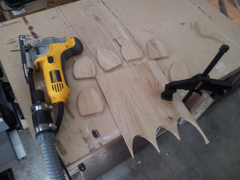 * Débits des différents morceaux à la scie sauteuse en utilisant les 2 gabarits en MDF :