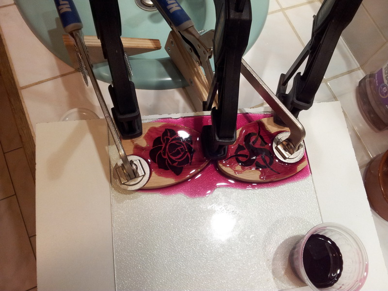 * 1er essai de coulage de résine directement posé sur un morceau de verre et fixé par serre-joint - Pas concluant car malgrès que les morceaux de bois soient plaqués au verre, la résine a quand même coulée :