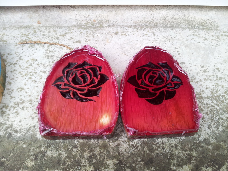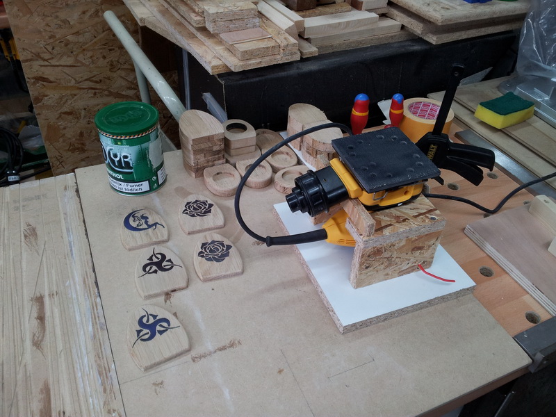 * Ponçage de finition du bois (grain 150, mouillage, 180, mouillage et 240) et pour la partie avec l'incrustation (grain 320, 400, 500, 600, 800 et 1000 le tout légèrement humide) :