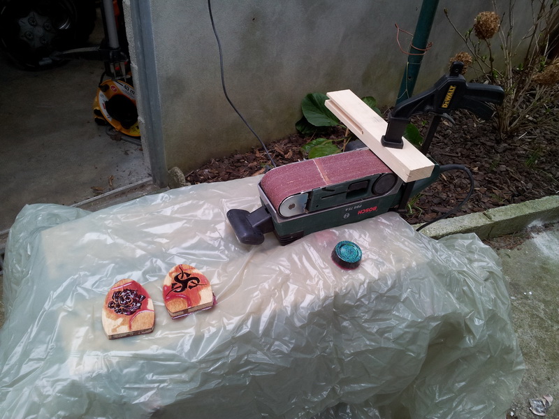 * Pour supprimer le surplus de résine et retrouver une surface nette, j'ai utilisé ma ponceuse à bande (grain 80 et 120) : (encore une fois gant et masque FFP3 conseillé et ponçage réalisé à l’extérieur)