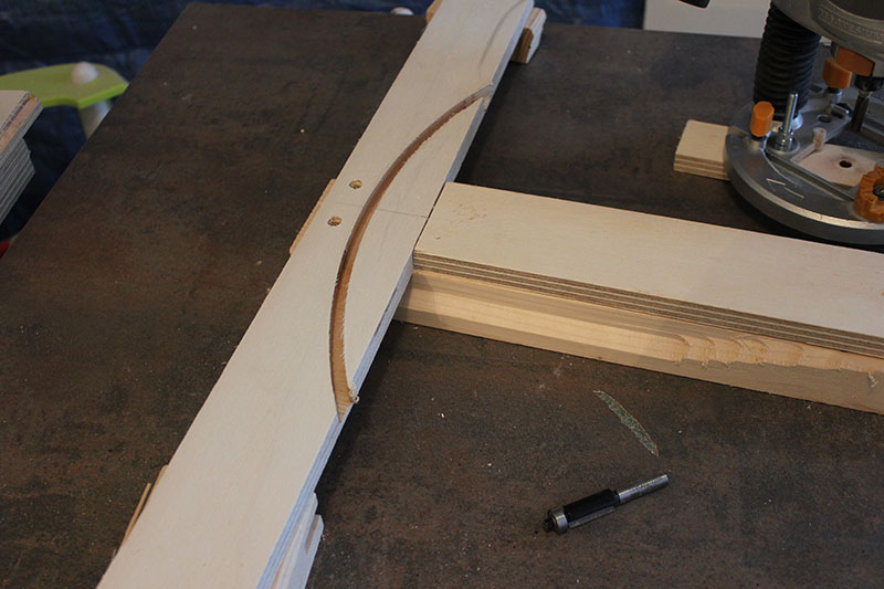 Je trace ensuite la courbure de la poignée sur les planches concernées, j’évide un maximum à la scie sauteuse, et me sert de mon gabarit fraîchement réalisé pour dupliquer la courbure. Première fois que je me sert d'un gabarit maison et d'une fraise à copier, et je suis plutôt content du résultat :)