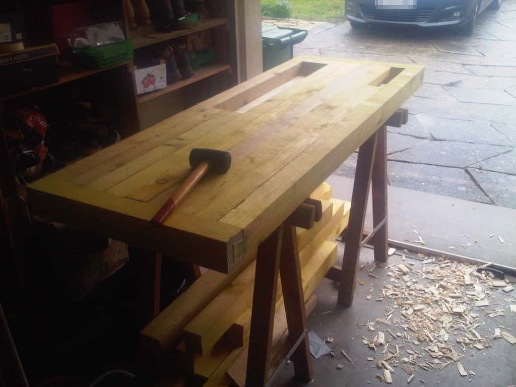 Pour la petite histoire, c'est votre faute si je me lance là dedans, après avoir certains de vos établis, j'ai eu envie de faire le mien. Et puis aujourd'hui, c'était journée affutage des outils fraichement commandés dans ce sujet. Pour faire ça, je me suis confectionné un "établi" composé de deux tréteaux et d'une planche de CP de 15 complètement gauche (si si c'est possible !) et pendant que j'aiguisais consciencieusement mes ciseaux, l'établi se promenait... Pas pratique. Ni une ni deux, je me suis décidé à m'en construire un !