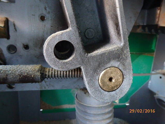 J'ai acheté récemment une combinée Lurem Former 360 RL dont le mécanisme de remontée de la scie est très dur. La scie fonctionne très bien et ça n'est pas très gênant, mais après examen, je crois avoir trouvé l'origine du problème. L'axe fileté de montée n'est pas en cause, mais c'est la noix de basculeur en bronze (pièce n°11 sur l'éclaté) qui ne tourne pas dans son logement. Quand le filetage de la noix est bien alignée dans l'axe, la rotation du volant est douce, mais quand on tourne le volant dans un sens horaire ou anti horaire, il devient de plus en plus dur car l'axe n'est plus aligné avec le filetage car la noix est bloquée. Voici quelques photos qui expliquent mieux qu'un long discours. 1- Quelqu'un a t-il déjà rencontré ce problème ?