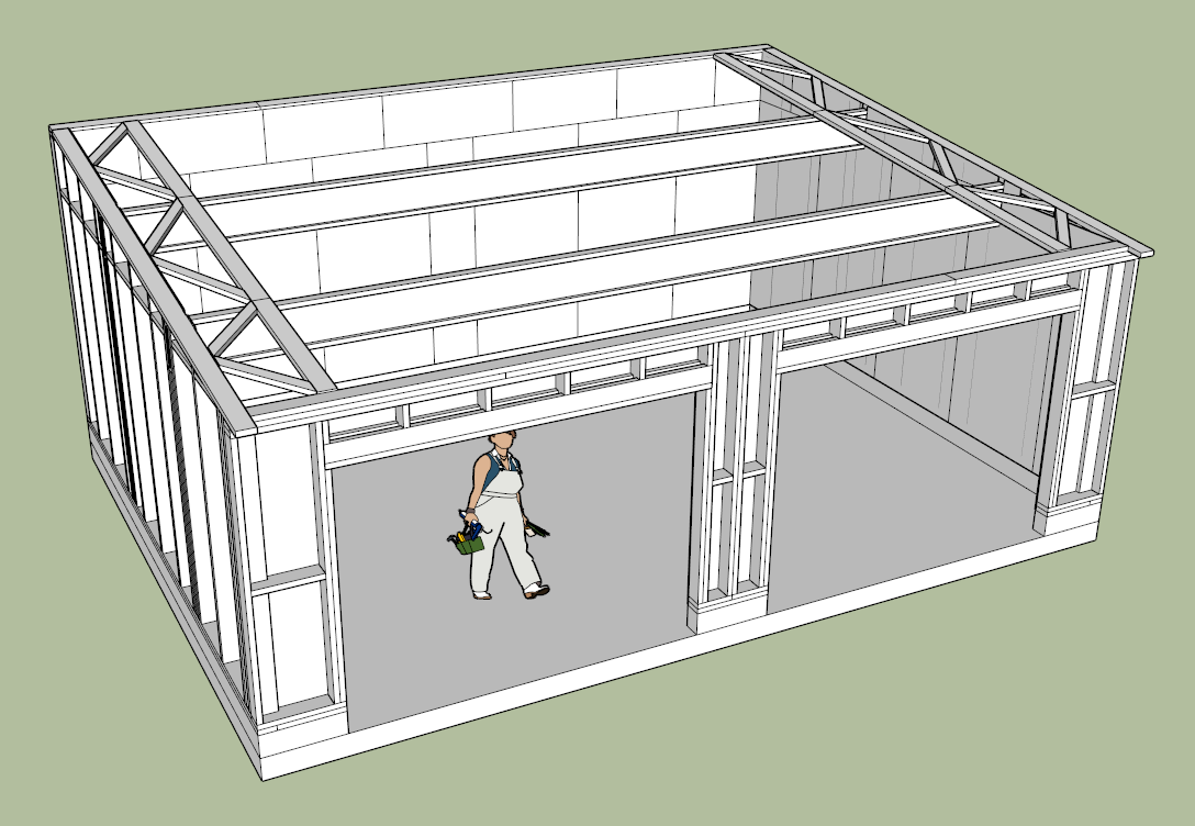 J'ai commencé a dessiner sous sketchup la dalle, les murs et j'arrive à la charpente. Ici mes connaissances ou recherches ne me permettent pas de définir ce qu'il faudrait mettre en place.