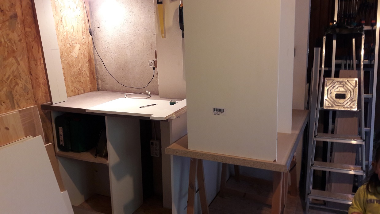 Au début, je pensais ne faire qu'un établi 'droit' dépassant sur un côté pour pouvoir tourner autour de la presse vertical, mais je me suis dit que compléter l'angle en prolongeant l'établi n'était pas déconnant et me permettrait d'avoir 2 espaces de travail 'spécifique'. Est ce une bonne conclusion?
