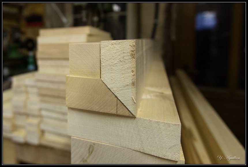 Une fois coupé en deux à la scie à ruban, un coup de raboteuse réglée à 45° (135° pour être exact) :