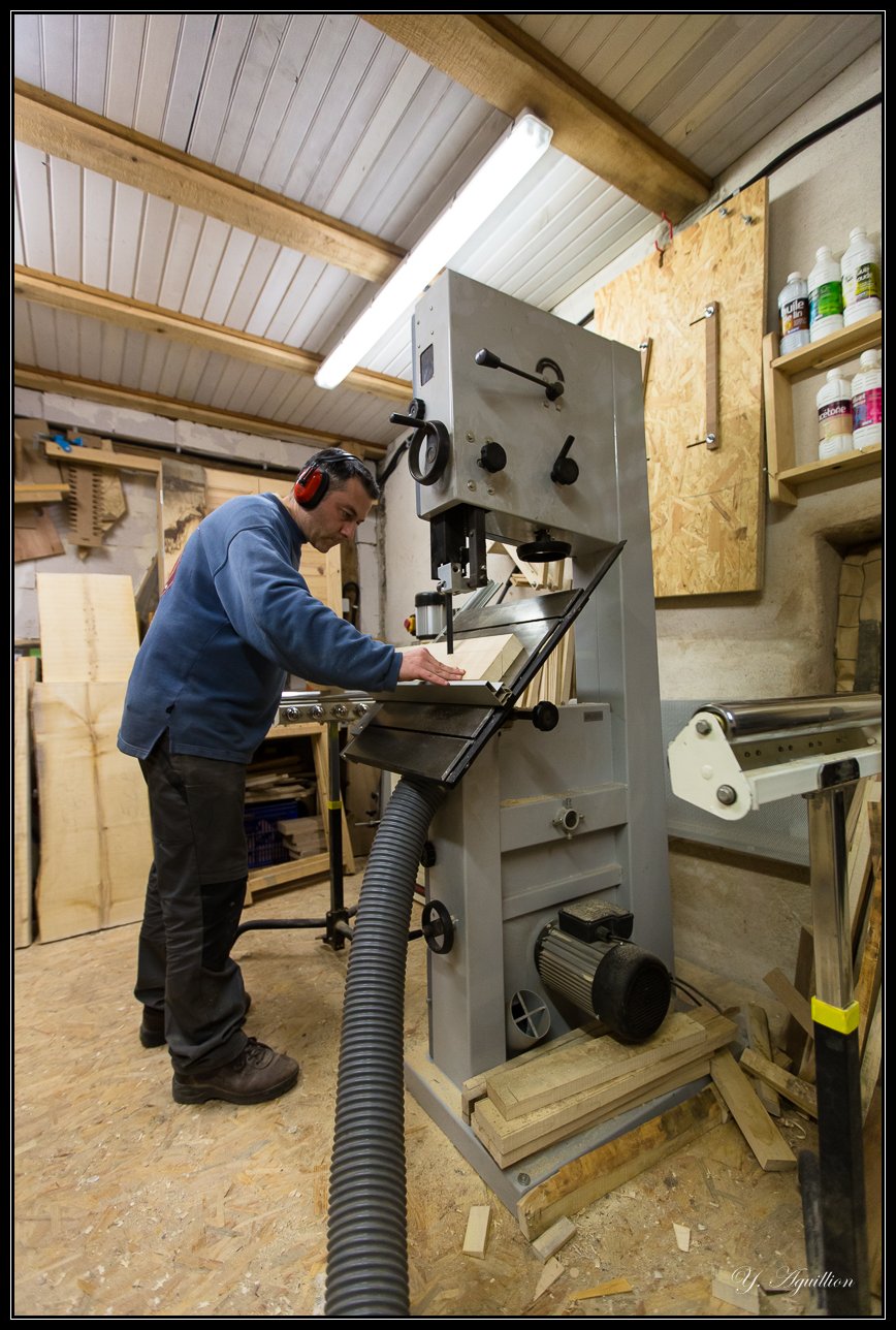 J'ai donc corroyé des section de 40 x 130 mm (un poil plus, pour raboter un coup de plus après collage), et je les découpe à la scie à ruban :