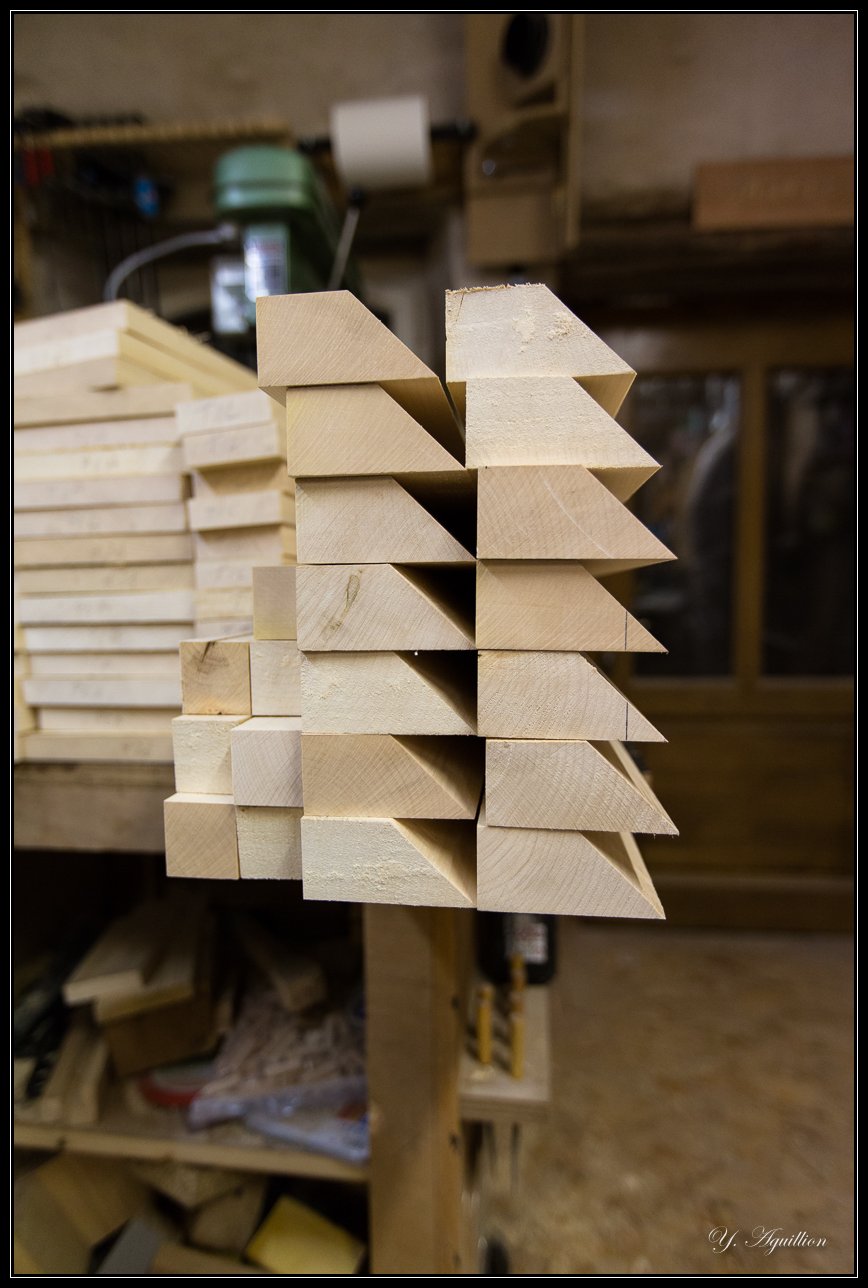 La difficulté technique de la journée aura été de préparer les 3x8 pièces qui constitueront les pieds. Les pieds fini auront une section de 80mm, carrée :