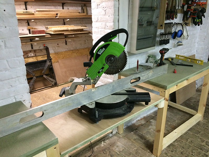 Et, j'ai opté pour une optimisation de la place au dessus du banc de scie un adaptation d'une vidéo placée plus avant, mais sans devoir me casser le dos a chaque mesure comme cela avait été mentionné plus avant.