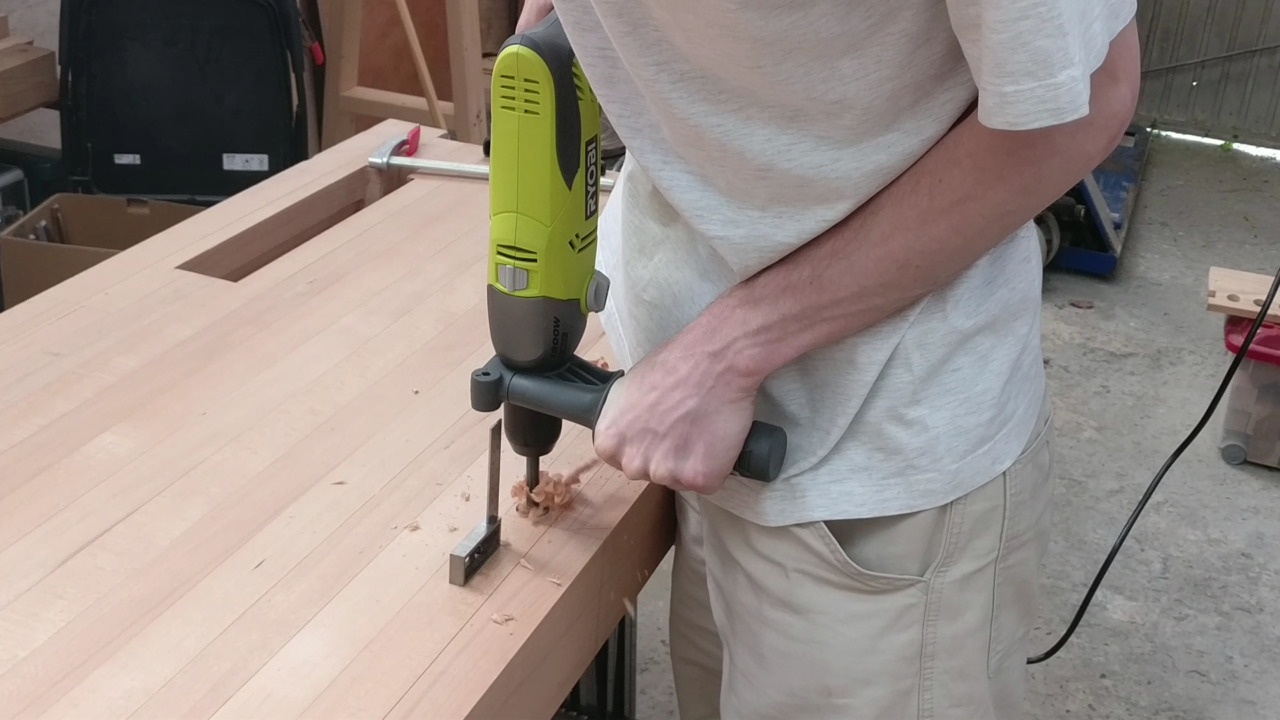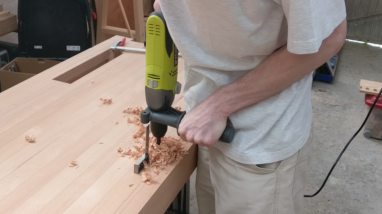 Vu qu'il y a quand même une sacrée quantité de matière à enlever, j'ai commencé à la mèche forstner de 25. Une petite équerre négligemment posée en face de la perceuse m'aide à visualiser la verticale.