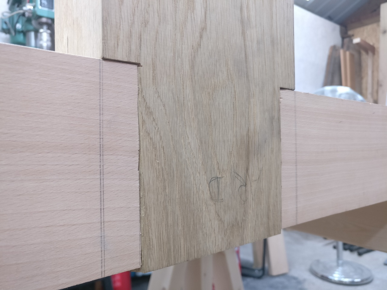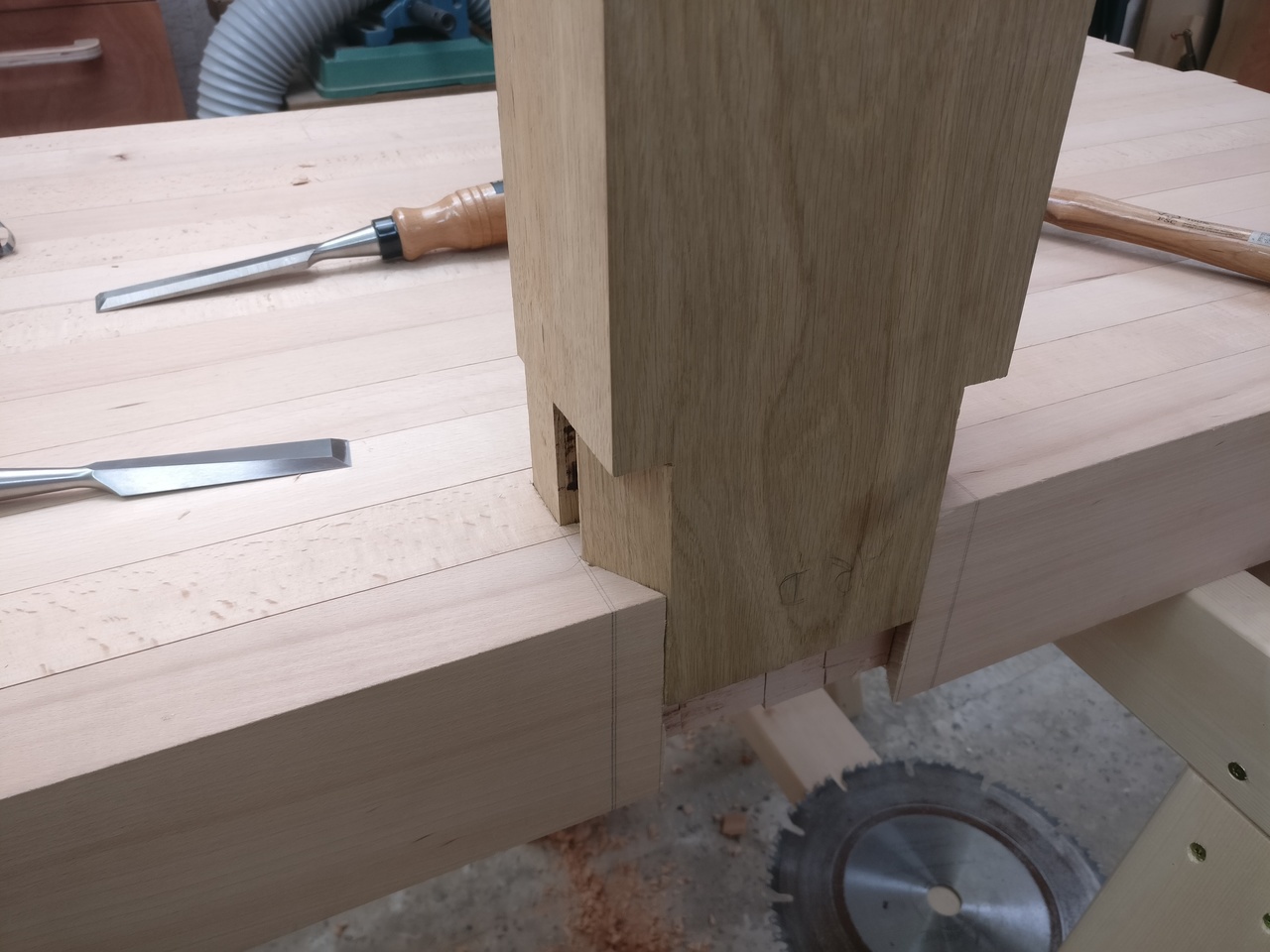 Mais ça y est, le premier pied se met en place! La mortaise n'est pas aussi bien ajustée que je ne l'aurais voulu, mais je suis quand même fier de moi