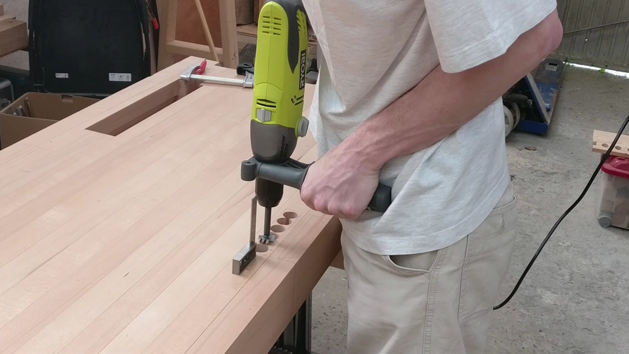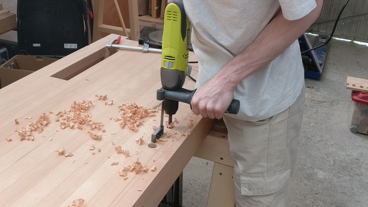 Samedi dernier, j'ai repris la perceuse et la mèche forstner pour dégrossir les mortaises qui vont accueillir les trois autres pieds. Et au moment de retourner le plateau pour percer depuis l'autre face...