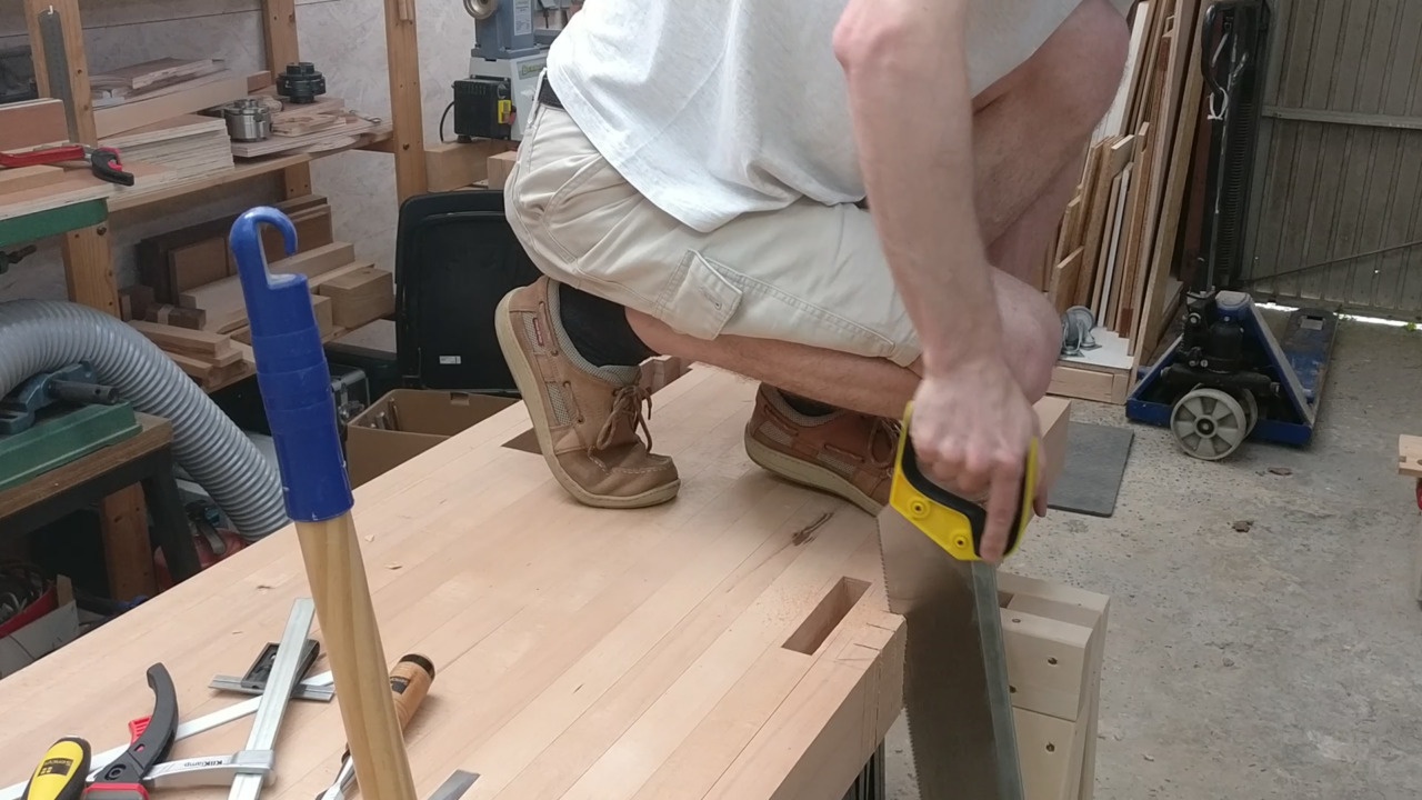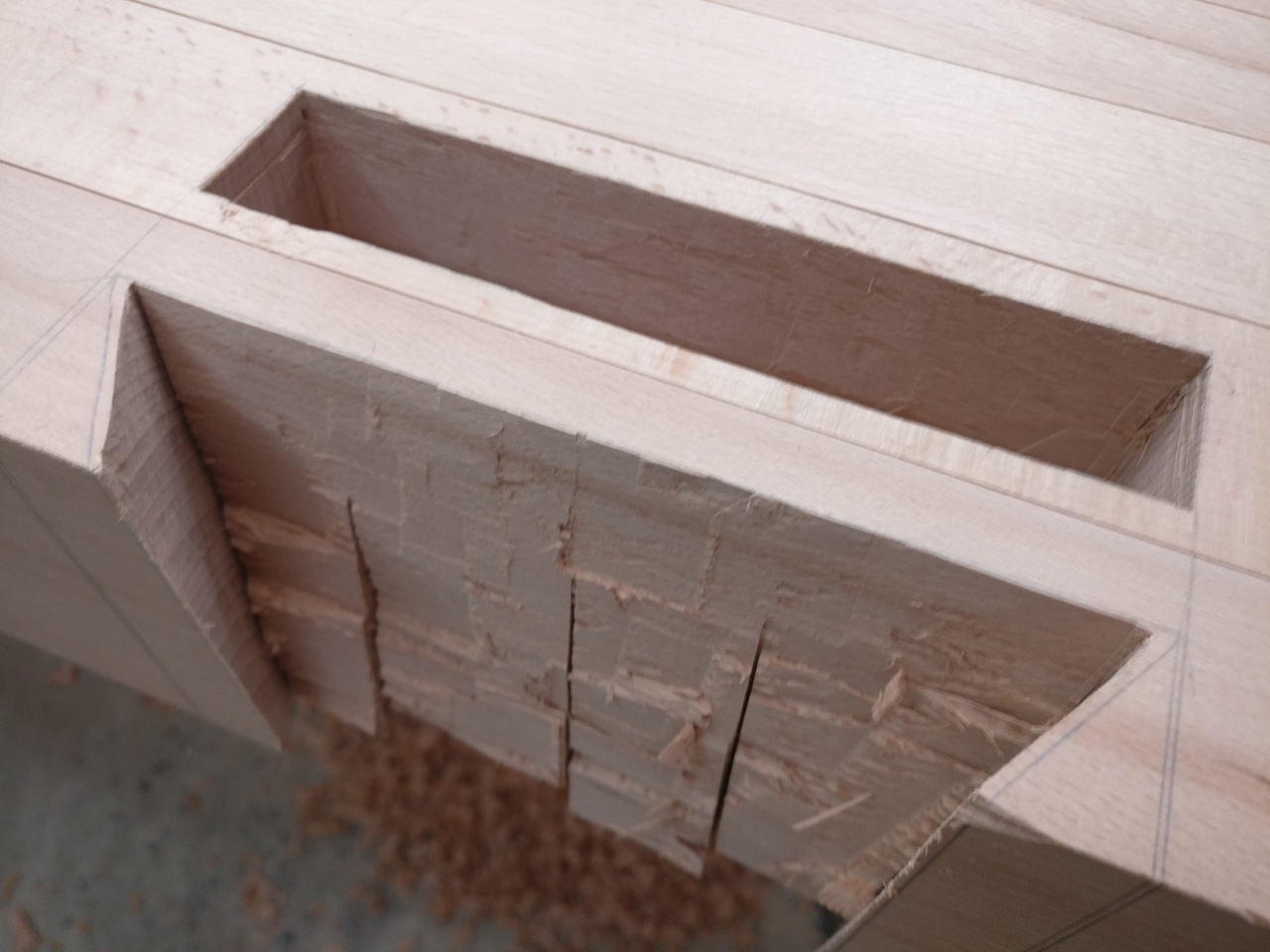 Une fois que la mortaise rectangulaire est presque prête, je peux couper la queue d'aronde. Comme c'est ma toute première expérience d'un tel sciage, je reste bien à l'écart de ma ligne. En voyant le résultat, je me dis que j'aurais pu scier bien plus près! Et plus tard, quand je vais devoir ajuster au ciseau, je me le redirai aussi