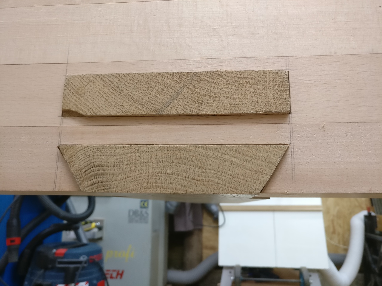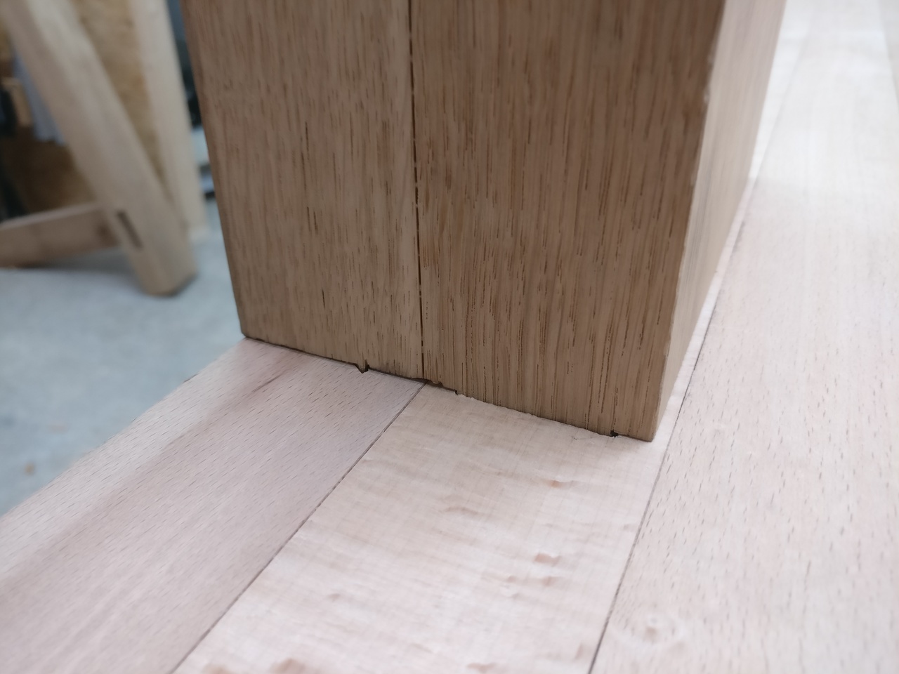 Même la queue d'aronde, où on pourrait se dire que la défonceuse pourrait creuser un fond bien net si elle était en appui sur le chant: eh bien non, même pas. Parce que cette queue d'aronde a été coupée à la main, le fond de la découpe ne doit pas être exactement parallèle au chant, il y a généralement un coté plus proche que l'autre (je m'en suis bien rendu compte quand j'ai reporté les tracés d'une face du plateau à l'autre).