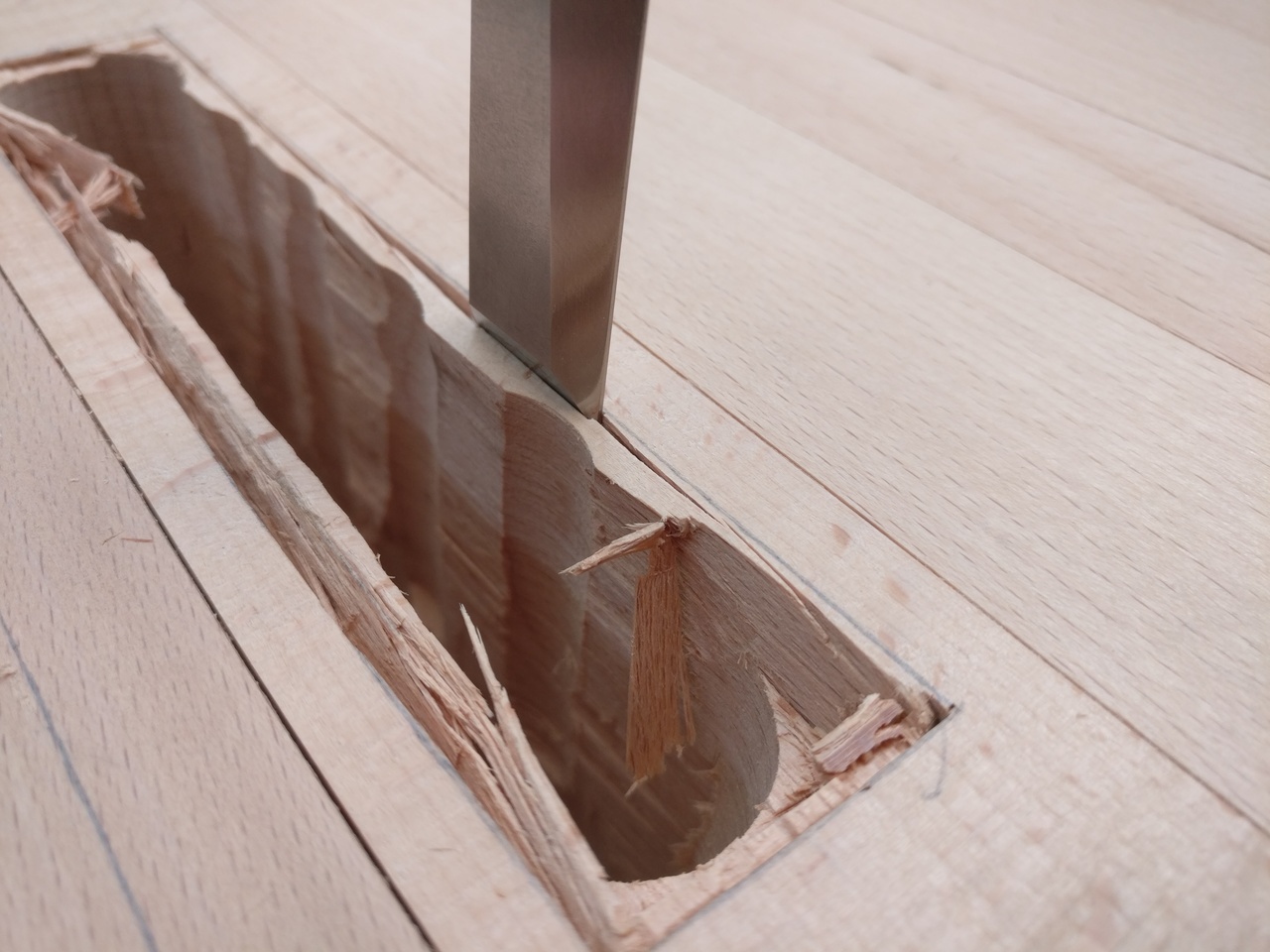 Je dois faire attention au sens dans lequel j'avance lorsque je retire de la matière. Il faut que le fil du bois qui se détache en se fendant parte vers l'intérieur de la mortaise, pas vers le plateau.