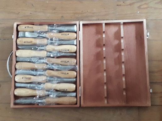 L'état de surface est à chi.... les burins de 14 et 16 mm sont inutilisables, les gouges demandes un affûtage d'enfer. Le ciseau oblique de 12 mm et les ciseaux droit de 13 et 6 mm sont eux acceptable après évidement un passage a l’affûtage
