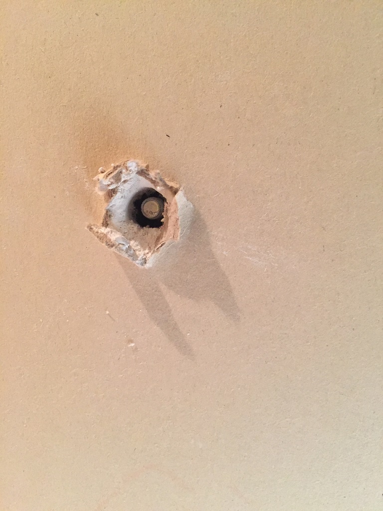je viens de chercher avec un aimant trés fort, on trouve juste sur un quadrillage de 600*600 environ, des tiges filetées m6 environ, perpendiculaires à la cloison qui en vent de l’intérieur, viennent juste affleurer la face externe du placo .Je ne vois pas comment est fait ce montage