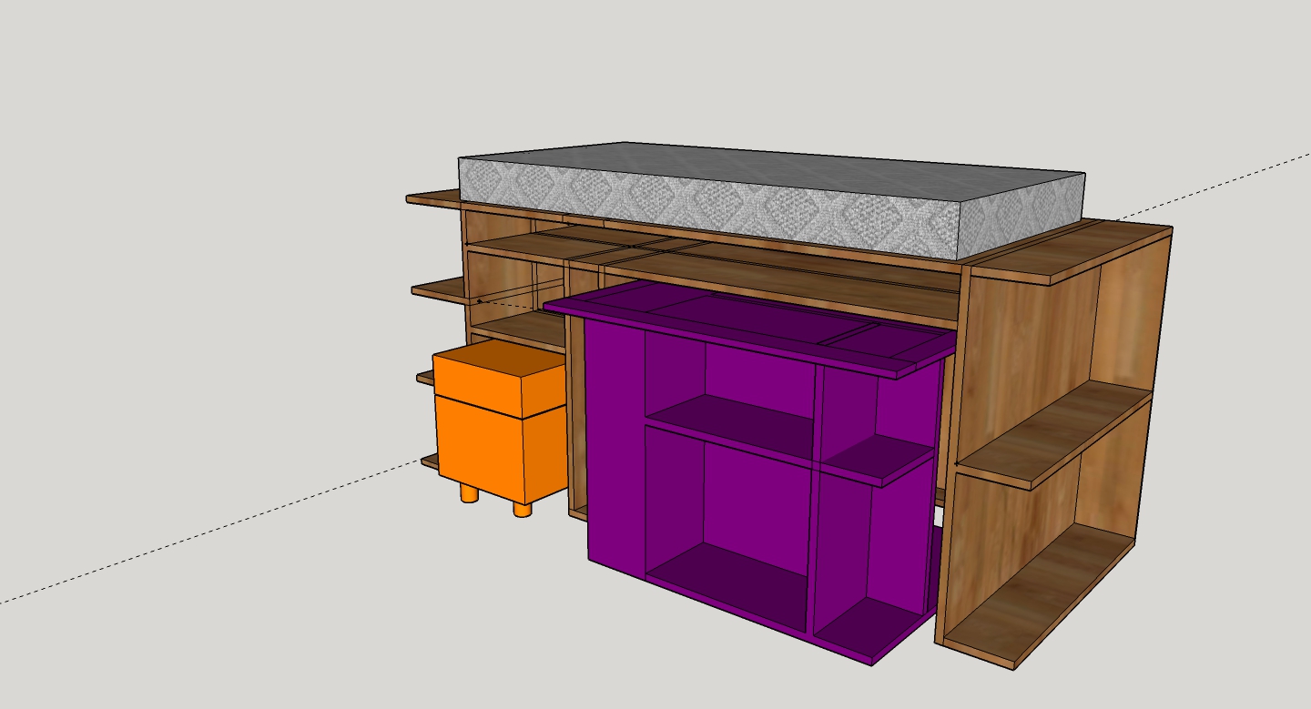 Je suis tout jeune bricoleur, je me suis mis au travail du bois depuis deux mois pour aménager le petit espace de ma maison, et j'ai fabriqué 4 meubles d'étagères sur mesure dans des espaces perdus, notamment une bibliothèque murale sur une corniche le long d'un escalier. J'ai un projet de lit d'appoint gain de place : je voudrais rehausser un sommier à lattes avec son matelas de 90 cm afin de pouvoir encaster dessous deux petits meubles : une table de couture/découpe et une malle. Je vous joins une image du projet (encore très schématique) : en orange, la malle (sur roulettes et pas sur pieds), et en violet la table de couture également sur roulettes. En brun, le meuble qui nous intéresse.
