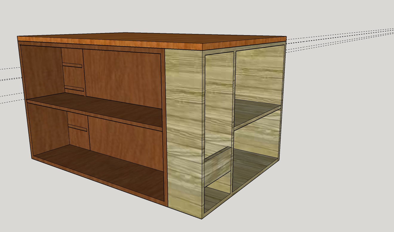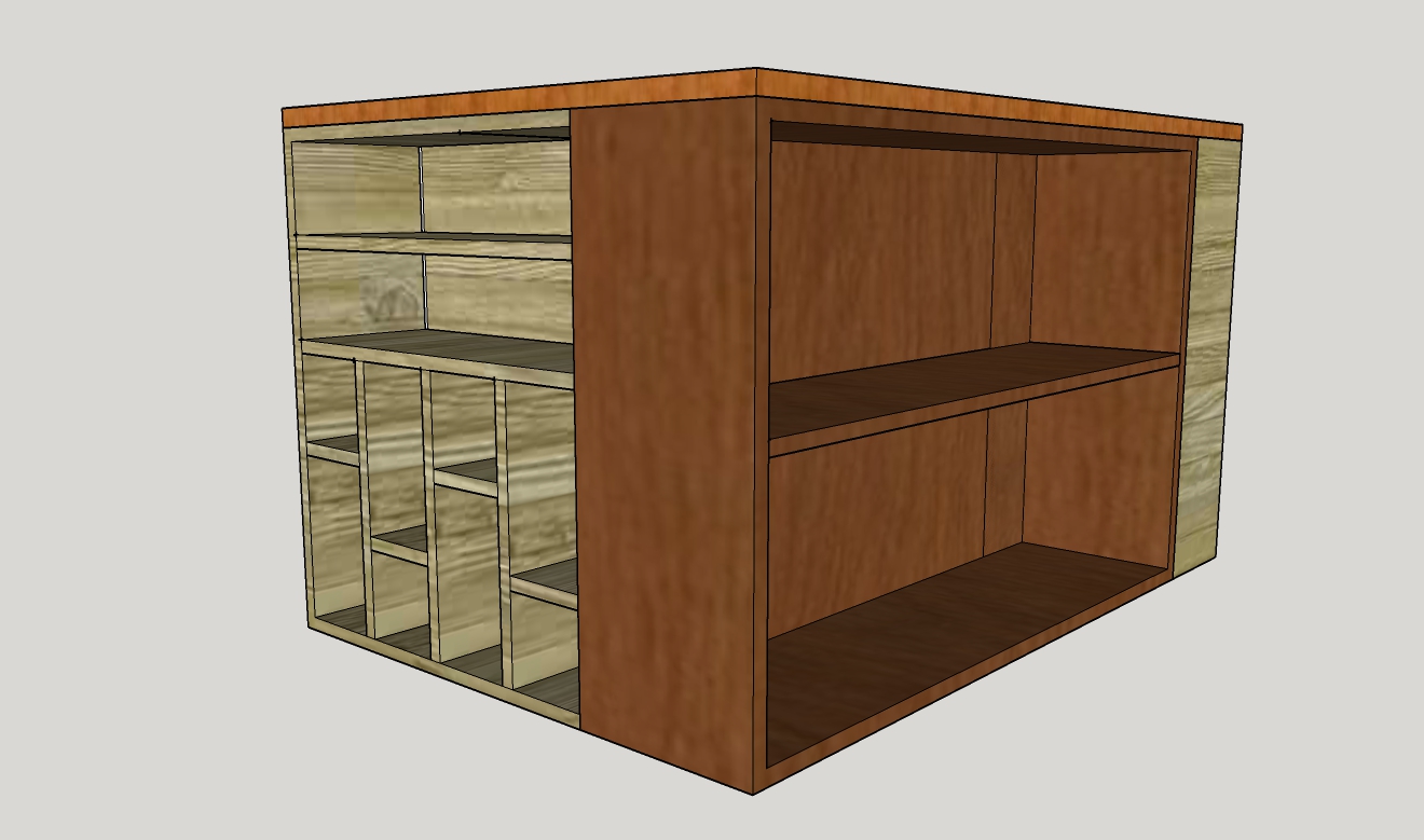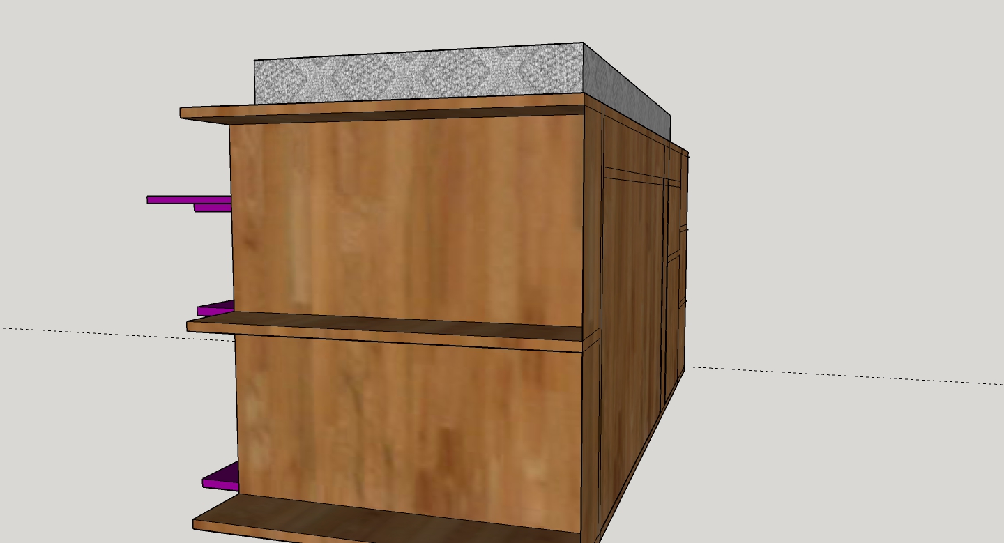 Le meuble violet va presque jusqu'au fond (sauf le dos du meuble brun) et est escamotable, donc il y a un vide important dans la structure du meuble brun. Vaut-il mieux à ton avis du pin épais ou un bois plus costaud un peu moins épais ?