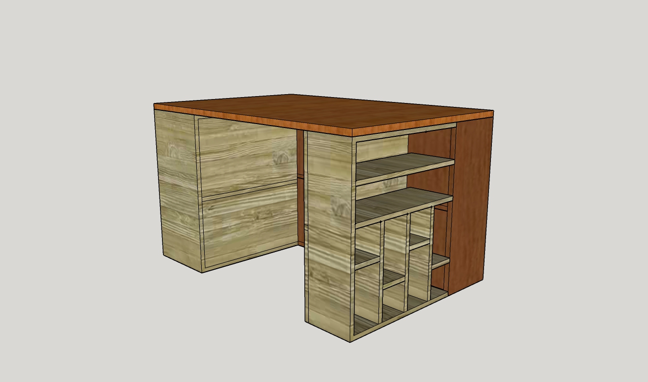 Completement d'accord avec Cdec, c'est ce que j'aurais dit. Il suffit de mettre des longerons à chant , ça évitera d'utiliser inutilement trop d'épaisseur de bois. Autre chose, à ta place je mettrai la tablette supérieure tout d'une traite plutôt qu'un assemblage qui va risquer de casser.