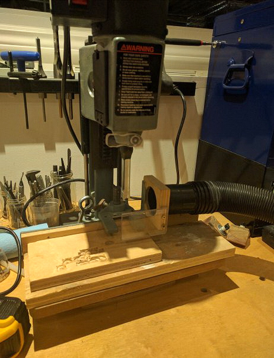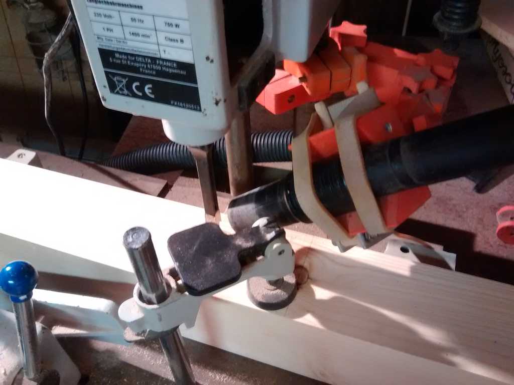 Un simple support pour le flexible d'aspiration des copeaux est installé sur la butée d'anti-soulèvement et positionne la bouche d'aspiration du flexible latéralement proche de la zone d'éjection des copeaux par l'outil (le bédane étant réglé pour éjecté les copeaux latéralement sur la mortaiseuse et non frontalement) (voir photos jointes)