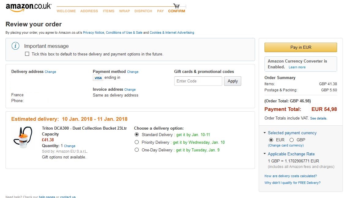 C'est amazon.co.uk mais j'ai pu y mettre mon identifiant amazon.fr. Puis j'ajoute au panier, je fais "add to basket" puis "proceed to checkout" puis j'y mets ma carte bleue VISA et en dessous il la reconnait en €uros mais me propose aussi de changer de devise : "change card currency"