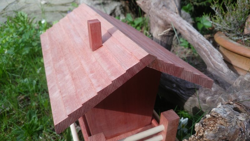 La maison/mangeoire sera fixée sur un poteau. Son toit se soulève pour faire le plein de graines. Les cotés peuvent être remplis par des pains de graisse.