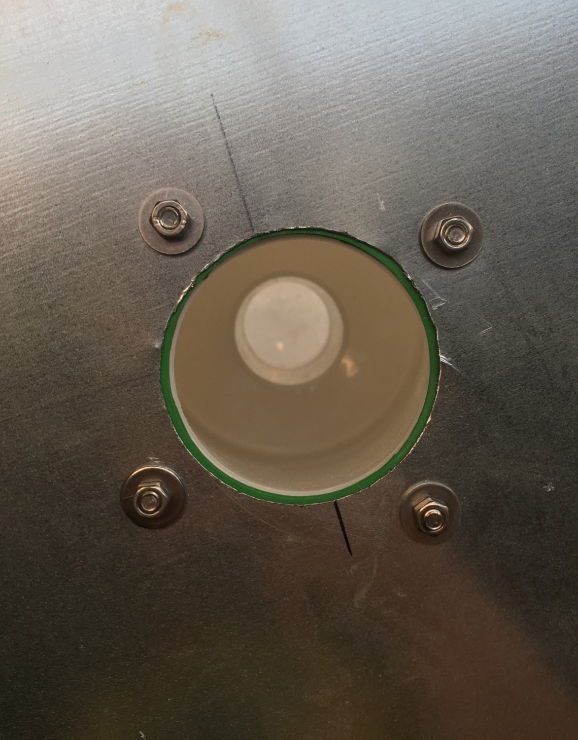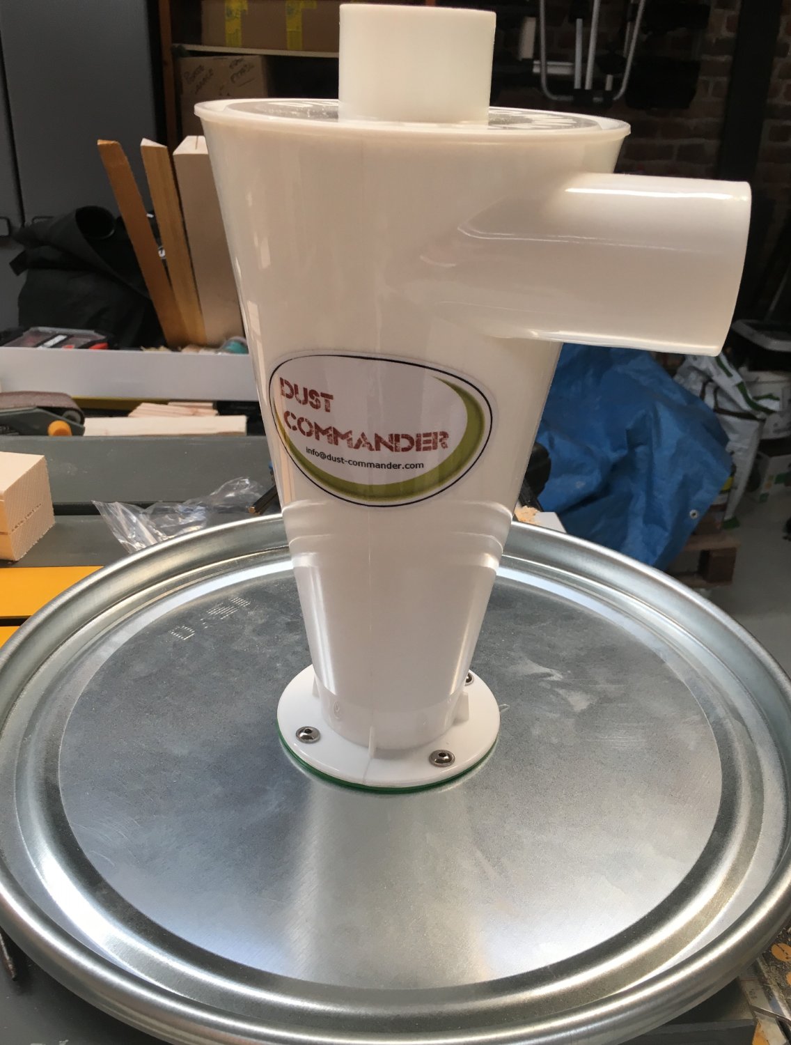 ) pour tracer le trou dans lequel s’enfichera le cyclone, ainsi que les trous de vis correspondants. Fixer joint (fourni) et cyclone avec la visserie (fournie). Voilà pour le plus difficile !