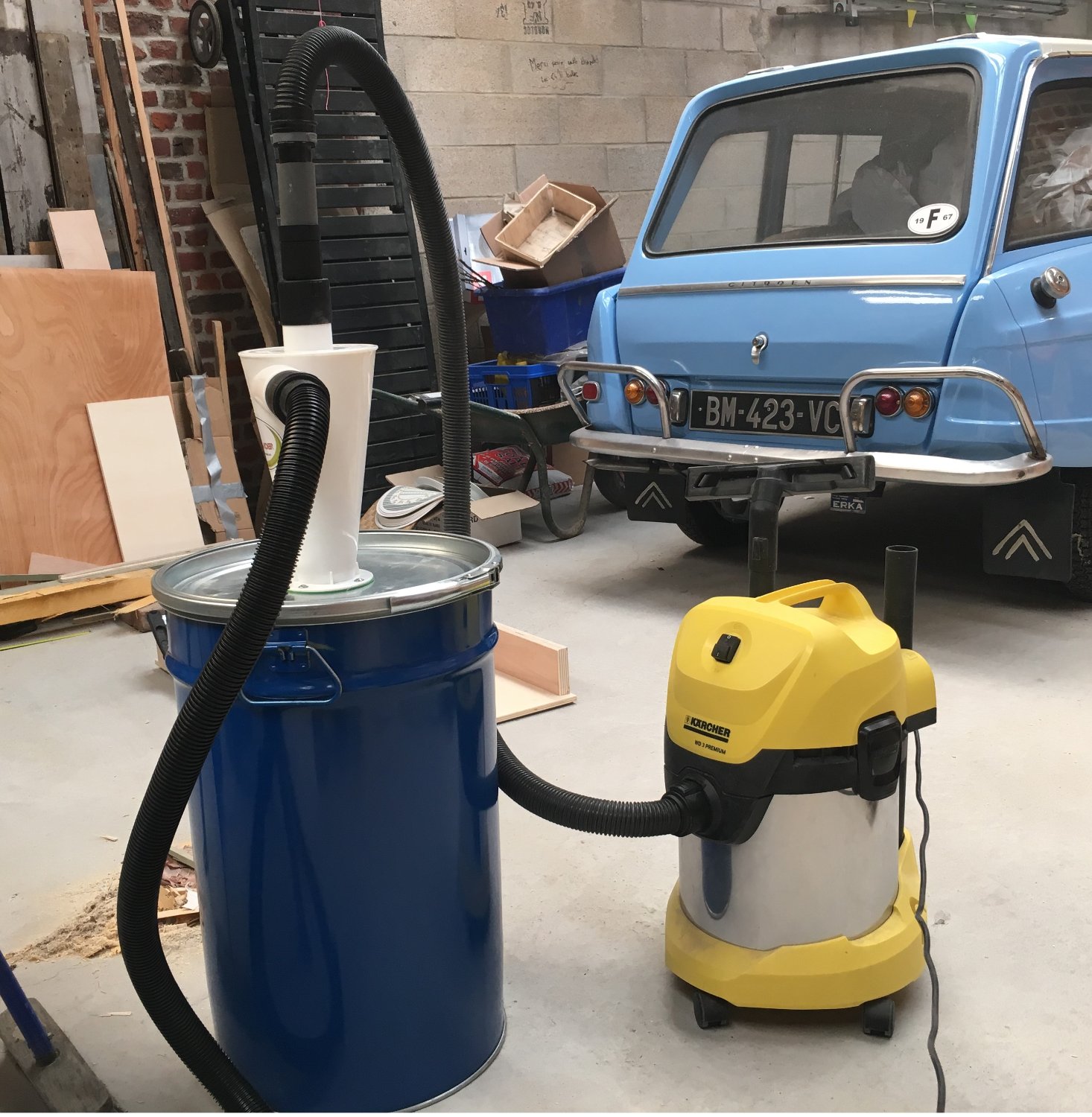 Suite à qques travaux générant de grosses quantités de sciure, j'aimerais m'équiper avec un système d'aspiration efficace qui ne flingue pas mon aspi Karcher. J'ai déjà vu pas mal de sujets là-dessu sur le forum, donc je pensais à: