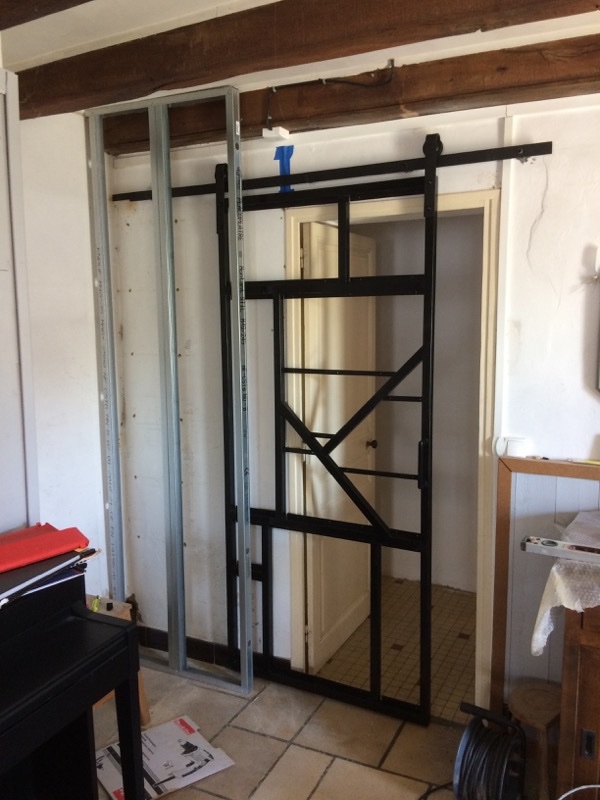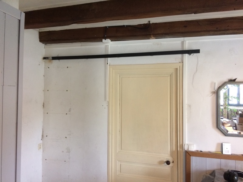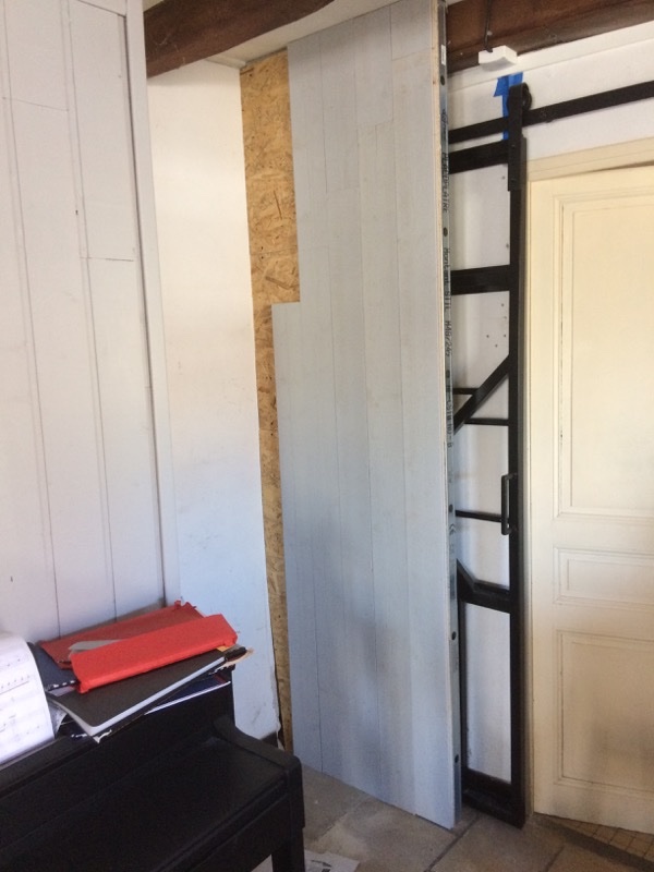 Après avoir fini la cuisine, un problème s'est posé : nous avions ouvert un passage sur un bout de couloir, et celui ci était desservi par une porte classique qui venait bloquer en partie le passage. L'idée de la remplacer par une porte coulissante s'est imposée rapidement.