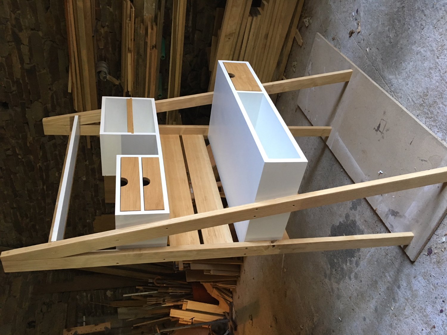 Un bureau réalisé en médium, châtaignier pour les pieds et en chêne pour les façade de tiroir, pas exceptionnel, juste pour donner des idées à des cdc en recherche d'inspiration.