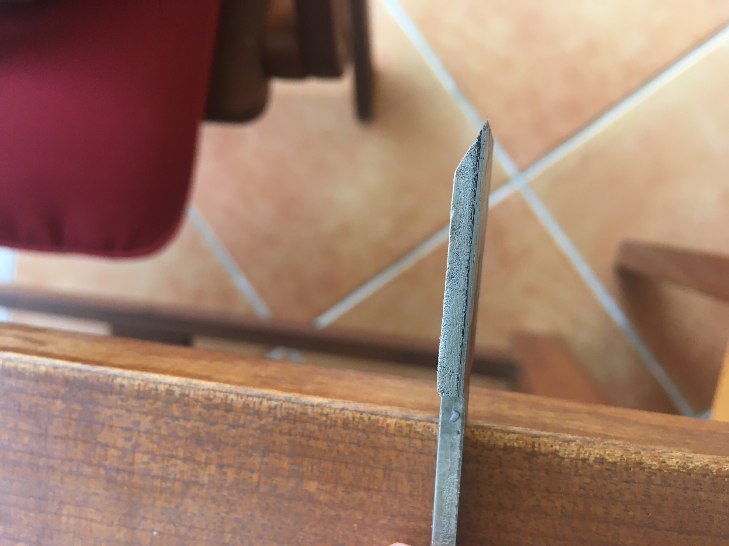 Je m'attaquerai d'abord au biseau pour voir si j'arrive à avoir une surface lisse sans ces stries sur la largeur. Je les trouve suspectes. C'est difficile de dire si elles sont juste superficielles et provoquée par la rouille ou si c'est un problème structurel - les 2 couches mal soudées entre elles et en train de se décoller. Dans ce cas j'éviterai de passer trop de temps dessus et c'est sûr que je le laisserai la planche telle quelle.
