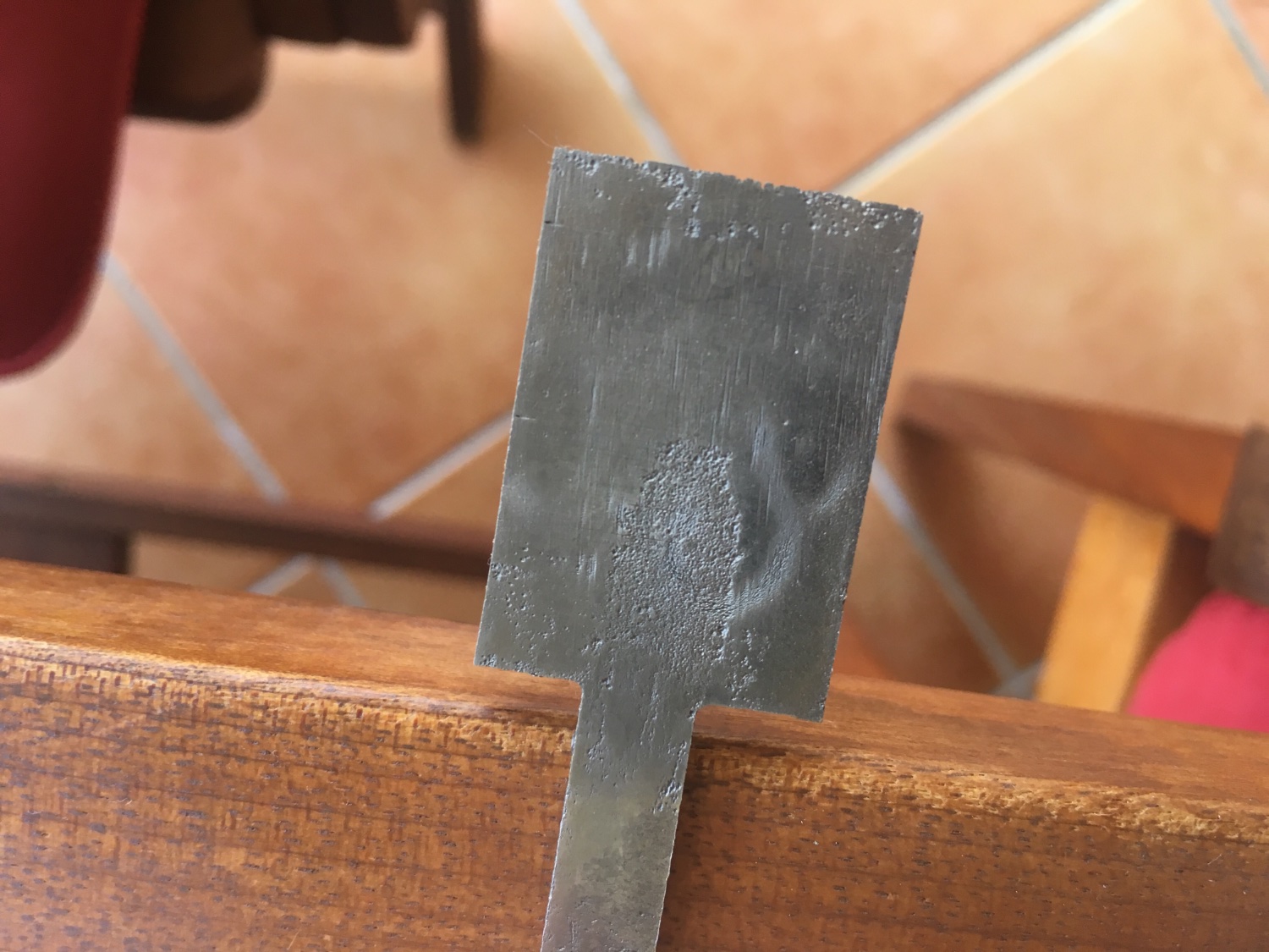 Il est en très mauvais état en effet mais je m'acharnerai un peu pour essayer de le récupérer car c'est un fer laminé. On voit clairement qu'il y a 2 couches de métal, une dure au dos (la planche) et côté biseau un acier doux. L'avantage c'est que c'est plus facile à affuter même si on a un acier très dur, donc tu n'auras pas de mal à rattrapper une surface propre au niveau du biseau.