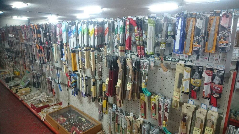 La devanture qui ne paye pas de mine Les rabots d'occasion, juste sous un jeu de katanas ! Des rabots neufs Heureusement que j'ai ce qu'il faut en scie, j'aurais été perdu devant le choix ! A moins de prendre ça, mais ça rentre pas dans la valise !