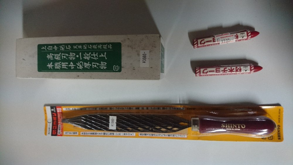 Une Rape Shinto pour 13 euros, des crayons gras pour 1,6 euros les 2 et surtout une pierre naturelle à affuter pour 30 euros environ (le tout sera de se mettre d'accord avec madame quant à son utilisation !).