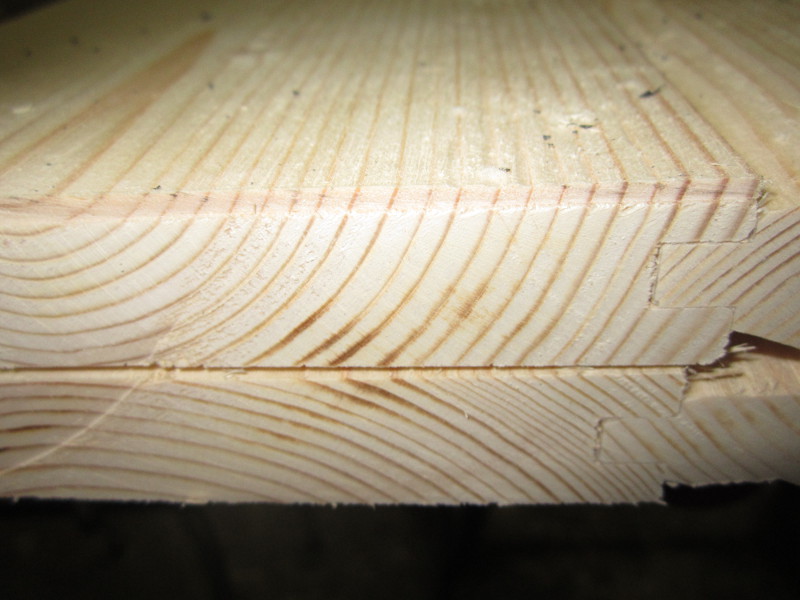 Par contre, petit soucis au niveau du rail, puisqu'il y a un petit effet balancier. Ajouter à cela qu'il y a un peu de jeu dans la machine, qui fait qu'on peut la pencher de quelques degrés dans que la semelle ne bouge, et vous obtenez une coupe en deux passes qui n'est pas plane (regarder le haut du champ de la planche du dessus):