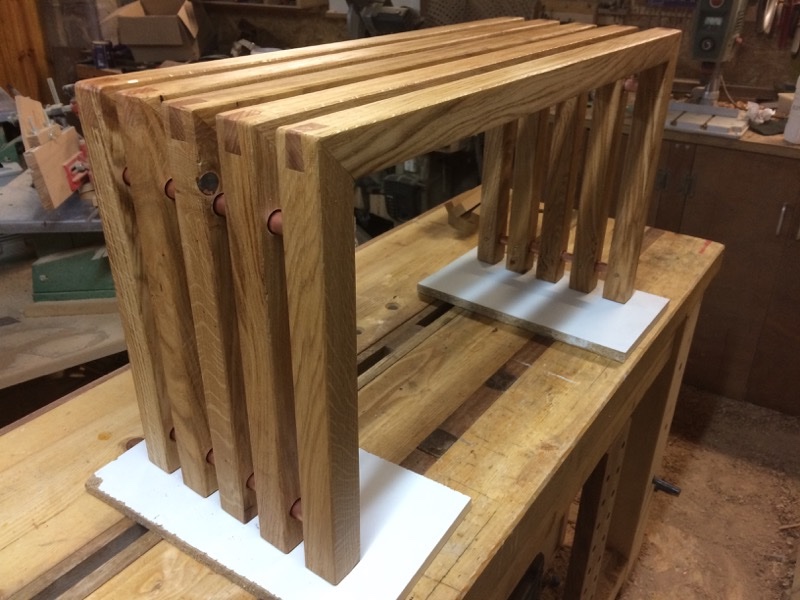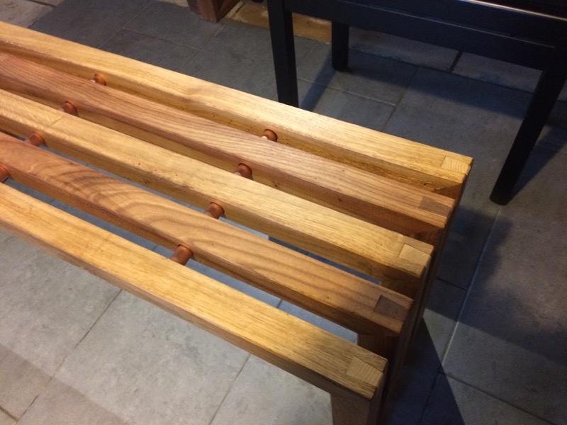 Et forcément, il a fallu que je joue au père Noël avec la réalisation d'un deuxième banc, cette fois ci tout en chêne (seule les clefs sont en ormeau) :